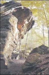 The jumbled rocks are the result of erosion, but it looks more like a giant came through the forest and made the boulders his personal building blocks.