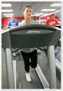 Sheila Sikora trains for a half-marathon on a treadmill at the gym.