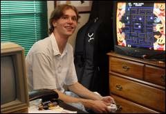 As a photographer takes his picture, Gahler turns his attention from a game in progress and stares at the camera. His hands, though, stay busy working the game controller, and on the television, Pac-Man continues his quest to gobble up dots and avoid ghosts, turning corners just in the nick of time as if using a sixth sense.