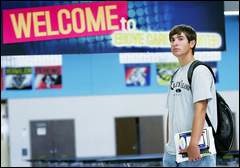 When Brian arrives for the first day of school, things have already started, as usual, because he is delayed by his transportation schedule. He has to check in at a welcome center, an attendance office, and then walk to another building where his first class, a study hall, is already winding down. Leaning back on a desk, he chats with the teacher and receives a welcome-back hug from another student.
