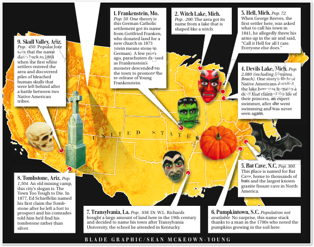 Here are nine other places that sound ready for Halloween year-round, with details provided by local Web sites, historians, and residents from these areas. (Most populations are their rough estimates.) Scaredy cats, beware!