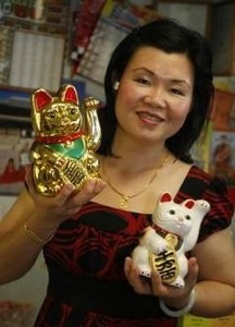 Statues of a cat raising its paw — a beckoning cat, or Maneki Neko in Japanese — are commonplace in Asian businesses and are thought to attract customers. Some people believe that a cat with its left paw raised will draw customers while one with its right paw up will bring money, said Mr. Kwan, the author.