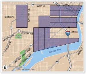 "One of Toledo's oldest neighborhoods and originally in Michigan, Huron St. Village was considered as the site of the University of Michigan. After the outcome of the Michigan-Toledo War of 1835 the area was permanently established in Ohio and averted the proposed location of the University from here."