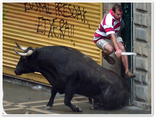 To the strange delight of everyone, the bulls (horns safely blunted) rush through time and again, smashing a path through the crowd. Often the wall of humanity parts just in time, but just as often the bull hits its mark and butts into anyone with a slow step. No harm done - the crowd simply rushes in to distract the bull and save one of its own.