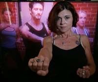 Million-Pound Challenge winner Bobbi Jo Blunk exercises to a ‘Budokon’ workout video. (THE BLADE/LORI KING)